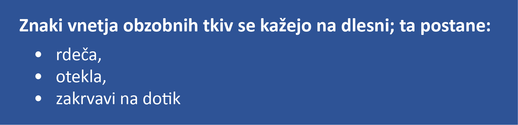 Vnetje obzobnih tkiv s strokovno besedo imenujemo parodontalna bolezen. Poleg skrbne ustne higiene je priporočljivo redno pregledovanje tako dlesni kot zob, ob pojavu znakov bolezni pa je nujen takojšen pregled pri zobozdravniku.